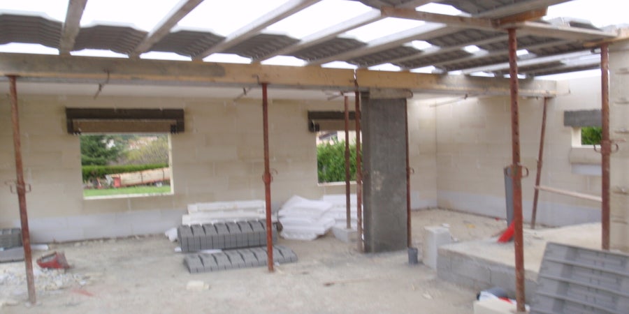 Face arrière ancienne cuisine et vue SAM puis après la pose d'une poutre IPN, décoration et ameublement séjour et cuisine